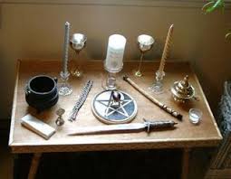 Altar Wicca, báculo (bastão mágico, pentagrama, taça de vinho branco para a mãe (Deusa Terra e Lua), e taça de vinho tinto para o deus pai (Sol). Uma vela branca para o deus Sol e uma vela preta para a deusa lua (luz da noite), caldeirão simbolizando o útero da mãe terra, adaga para proteção, incenso, pós, essências...